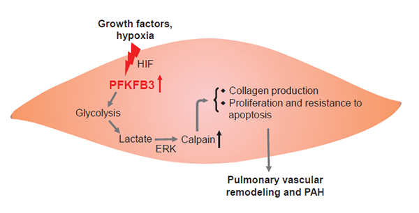 图2. 平滑肌细胞中PFKFB3介导的糖酵解对肺动脉高压发展的影响模式图