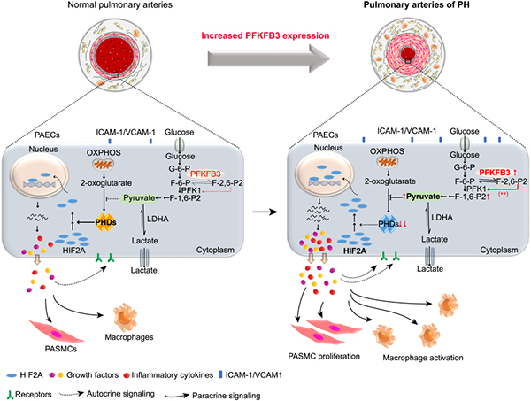 图1. 内皮细胞中PFKFB3介导的糖酵解对肺动脉高压发展的影响模式图