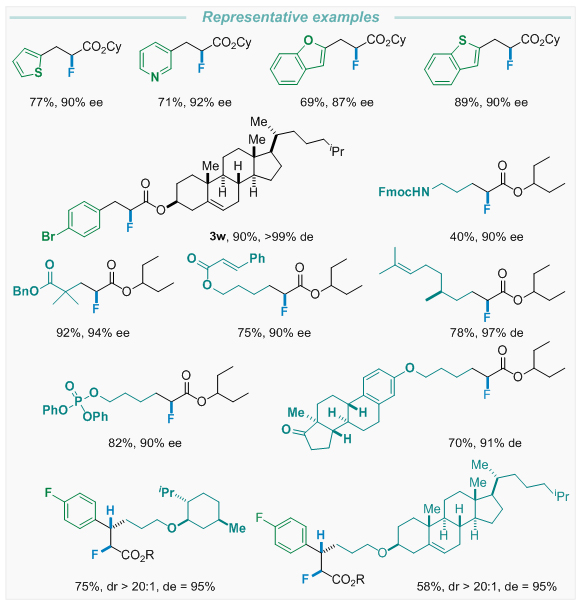 这一策略以氮杂卡宾的“极反转”催化效能,实现烯醛化合物ꞵ-位点的亲核性 (Homoenolate),对接“质子梭”的氢正转移步骤,实现不对称质子化。随后,平衡α-位点的亲核氟化效率以及亲核试剂对催化剂的循环效率,实现不对称氟化。在这一氧化还原中性条件下,诸多反应官能团可被容忍,包括杂原子芳环、酰胺键、酯基、孤立双键、磷酸酯及Michael受体等,均可顺利得到目标的不对称氢氟化骨架。该合成方法亦初步论证其在复杂骨架后期修饰中的应用,以较高效率获得类药含氟手性化合物。