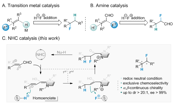 基于此命题,黄湧课题组提出新颖的氢正-氟正串联反应模式,一步实现烯醛化合物的不对称氢氟化反应,在氧化还原中性条件下构建α,ꞵ-不对称含氟羰基化合物。此前,该课题组发展仿生迁移的“质子梭”策略,通过手性氮杂卡宾 (N-heterocyclic carbenes, NHCs) 介导β-双取代烯醛化合物的不对称质子化反应 (J. Am. Chem. Soc. 2017, 139, 7045; Chem. Commun. 2018, 54, 1473; Angew. Chem. Int. Ed. 2018, 57, 8503; Acta Chim. Sinica 2018, 76, 850)。在此基础之上,通过反应物种实时浓度及内观性质的平衡调控,实现催化循环过程中额外的不对称氟化步骤的引入,以完整的化学选择性、非对映选择性及对映选择性得到目标官能团化产物,成果在线发表于《德国应用化学》,题为“Enantio- and Diastereoselective Hydrofluorination of Enals via N-Heterocyclic Carbene Catalysis”(Angew. Chem. Int. Ed. 2019, DOI: 10.1002/anie.201902989)。