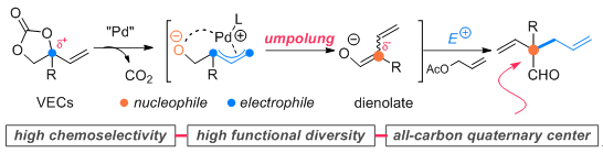 VEC 在钯催化下生成的带烷基氧侧链的 π-烯丙基钯中间体,通常可作为1,3-或1,5-偶极子发生环加成反应,或者利用π-烯丙基钯中间体的亲电性,与亲核试剂发生取代反应,而关于 VEC 作为亲核试剂的研究却鲜有报道。翟宏斌课题组在钯催化的 VEC 脱羧反应研究中发现,π-烯丙基钯中间体发生β-H消除,导致极性发生反转,即亲电性的π-烯丙基钯中间体转变为具有亲核性的二烯醇负中间体。二烯醇负中间体与亲电试剂乙酸烯丙酯进行C(sp3)-C(sp3)偶联,可以简洁、高效地合成α位含有一个全碳季碳中心的脂肪醛。该反应不仅具有良好的化学选择性和区域选择性,而且具有很好的底物普适性,特别是对杂环底物(如呋喃、噻吩、吡啶等)和结构复杂的雌酚酮衍生物等都具有兼容性。