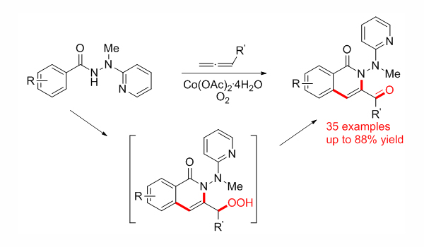 最近,翟宏斌课题组在原有工作的基础上,在芳基酰肼结构中以2-(1′-methylhydrazinyl)pyridine (MHP)为双齿导向基,以廉价的Co(OAc)2.4H2O为催化剂,在氧气氛围下,成功地实现了联烯的三官能团化,并通过该方法高效合成了一系列3-酰基喹啉类化合物。该反应底物适用范围好、区域选择性高、产率中等至优秀(最高达到88%);此外,所用导向基团中的N-N键可在温和条件下以SmI2进行选择性切断,后续衍生化非常方便。