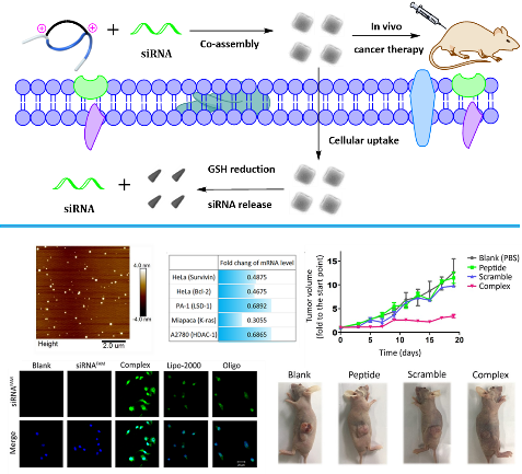 核酸类药物是临床上用于治疗病毒感染性疾病、肿瘤、艾滋病的一类重要的药物。以RNAi效应为基础的siRNA药物由于易合成,可以时空可控地靶向任意蛋白等性质,受到了广泛的关注。但是由于RNA类药物自身容易降解并且不易穿膜,因此迫切需要发展高效并且具有良好生物相容性的核酸运载体系。多肽作为一类生物体内自身存在的生物分子,具有非常高的生物相容性,并且被证明可以作为有效的核酸运载体,在生物医学领域的应用已经受到很高关注。但目前使用的多肽运载体系普遍长度较高(长于20个氨基酸),制备困难,费用昂贵。我们根据自主开发的“硫盐修饰的胞内可逆还原策略”,在筛选了一系列多肽后,最终得到了可以在siRNA的诱导下自发与siRNA共组装形成稳定均一的siRNA纳米运载体,只需要九个氨基酸的多肽就可以实现在不同细胞系(HeLa, PA-1, Miapaca-2, A2780)中的有效,低毒的siRNA运载。这种多肽-核酸复合物不但具有很高的生物相容性,并且在裸鼠肿瘤模型中表现出了明显的肿瘤抑制效果。该研究成果于近日发表在国际著名期刊《Material Horizons》(IF:10.7)题为:“siRNA-induced peptide co-assembly system as a peptide-based siRNA nanocarrier for cancer therapy”。 以上工作由威廉体育williamhill深圳研究生院2015级博士研究生李文君同学完成。目前李文君同学正在进行该运载体系的进一步优化以及应用拓展,在合作者的研究中已发现此类运载体系可有效的转染间充质干细胞(MSC)。(链接:http://pubs.rsc.org/en/content/articlelanding/2014/mh/c8mh00392k#!divAbstract)