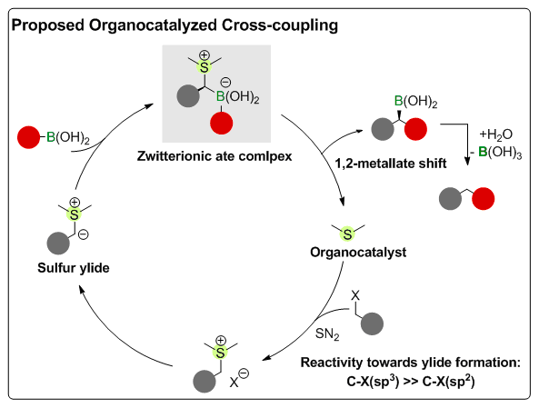 黄湧课题组受到有机硼化合物1,2-迁移反应(1979年诺贝尔奖反应)以及硫叶立德化学的启发,利用基础有机化学中亲核取代反应对于烷基亲电试剂和芳基亲电试剂的分辨能力,构想出一个同时含有正负电荷的中间体(zwitterionic ate complex),以此为基础,推演出有机小分子催化机理,并以苄基卤代烃和芳基苯硼酸作为模型反应进行研究,优化催化剂结构,最终不仅实现了首例非过渡金属催化的Suzuki反应,还获得了和传统过渡金属催化机制相互补的反应活性。新催化体系中,对烷基亲电试剂选择性要远高于芳基亲电试剂。传统偶联反应中最为活泼的芳基碳-碘键和芳基碳-溴键在新催化体系下并不不受影响,产物中可以得到保留,并且为后续流水式衍生化合成提供了反应位点。而初步的机理实验,也验证了设计的催化机制,为以后交叉偶联反应的发展提供了新思路。