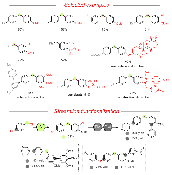有机硼试剂和有机亲电试剂的偶联反应,即Suzuki-Miyaura偶联反应是目前人们构建碳-碳键最行之有效的方法,2010年诺贝尔奖的颁发更加印证了其对人类社会的贡献。在过去的50年中,过渡金属作为催化剂在这类反应的发展中扮演了核心角色,但由于过渡金属催化本身的反应特性限制,也面临着诸多挑战。例如sp2杂化的芳基卤代烃反应活性高于sp3杂化的烷基卤代烃,当分子中存在多种碳-卤键时,选择性地优先转化烷基碳-卤键就是一大难题。