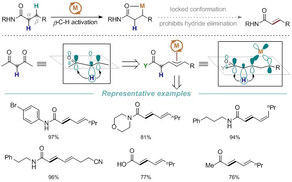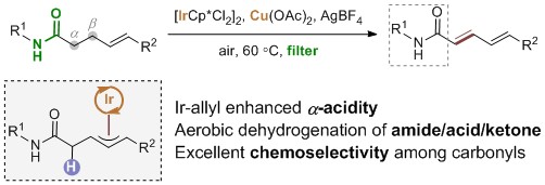 这一工作以铱/铜协同催化策略,以空气作为外源氧化剂,实现了共轭双烯羰基化合物的高效合成。不同于常用的α-去质子化策略,这一工作首次利用了β-碳氢键活化,通过在酰胺γ,δ-位引入双键,将金属从稳定的五元环状过渡态中释放出来,所形成的烯丙基铱中间体可以增强羰基α位的酸性,有利于进一步脱氢反应的发生。在温和条件下以较高的收率获得共轭双烯酰胺、羧酸及酮类化合物,多种官能团都可被容忍。值得强调的是,该反应中水是唯一的副产物,后处理非常简单,仅需简单过滤即可得到分析纯的目标产物。