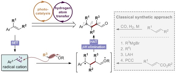 醛基是一类重要的官能团,在合成化学中有着广泛的应用,可进行多种化学转化,并作为复杂骨架的关键合成子。然而,非线性脂肪醛类化合物在合成上较具挑战性,在已有的报道中,大多需要比较苛刻的反应条件或者相对繁琐的转化步骤,且面临区域选择性的问题。而对于α,β,γ连续取代的醛类化合物,目前尚无任何合成报导。2017年,威廉体育williamhill深圳研究生院黄湧教授课题组与北卡罗来纳大学教堂山分校David A. Nicewicz教授合作发展了有机光敏剂与氢转移试剂的协同催化策略,单电子氧化苯乙烯类化合物,利用关键的自由基正离子中间体实现高度选择性的杂二聚反应,同时以高非对映选择性(dr > 20:1)合成一系列多环骨架 (Angew. Chem. Int. Ed. 2017, 56, 6896-6900)。基于这一创新性的协同催化策略,近期该研究团队利用可见光诱发单电子转移 (Single electron transfer, SET),在温和条件下一步合成多种取代类型的脂肪醛类化合物,成果发表于德国应用化学,题为“Direct Synthesis of Polysubstituted Aldehydes via Visible-Light-Catalysis” (Angew. Chem. Int. Ed. 2018, DOI: 10.1002/anie.201712384)。