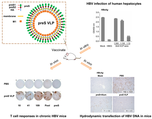 在本项研究中,研究人员设计了一种嵌合的preS VLP疫苗,由流感病毒的基质蛋白(M1)和流感病毒血凝素(HA)的跨膜区与胞内区组成颗粒骨架,乙型肝炎病毒的preS抗原被展示在颗粒的表面。研究人员发现VLP中preS结构域上的Asn112 位和 Ser98 位分别被N-和O- 糖基化修饰,并且Ser98 位被O-糖基化修饰是首次报道,糖基化修饰的生理功能以及糖基化修饰和免疫原性之间的关系有待进一步探讨。相比于preS重组蛋白联合佐剂应用,preS VLP在不使用佐剂的情况下,仍然展示出更强的免疫原性,可以引起更高水平的anti-preS抗体;该抗体可以在体外有效阻止乙肝病毒感染人的肝细胞。并且,preS VLP在Balb/c小鼠和乙肝转基因小鼠上可以刺激preS特异性的CD8+ 和CD4+ T细胞响应。此外,在水动力注射法制备的乙肝病毒复制小鼠模型中,preS VLP起到了较好的预防保护作用。综上,该研究揭示preS VLP有潜力被发展成为预防性或者治疗性的乙肝疫苗,为抗乙肝病毒策略提供了一种新思路。