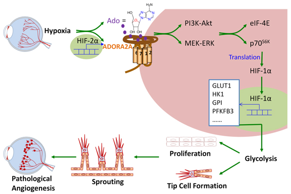 腺苷是一种独特的细胞代谢调节物,能够影响细胞多种生理过程从而调节机体不同组织器官的生理功能。细胞外腺苷对不同细胞生理过程的调节作用主要是通过分布在细胞膜上的腺苷受体(Adenosine receptors, ARs)介导的。ARs属G蛋白偶联受体,包括四种亚型:ADORA1, ADORA2A, ADORA2B和ADORA3。有研究人员对I型糖尿病病人进行长达20年的跟踪研究发现,ADORA2A基因变异(SNP rs2236624和SNP rs4822489)与PDR的发病率呈显著的相关性。本研究中,霍玉庆/洪梅课题组通过对NIH数据库的临床资料分析发现I型糖尿病病人的ADORA2A基因当有与高糖尿病视网膜病变的SNPs发生时,其ADORA2A mRNA表达上调(rs2236624, P=0.08; 和rs4822489, P<0 .01);体外研究发现,当人视网膜微血管内皮细胞暴露于缺氧环境下,adora2a表达显著上调,而其它三种ars的表达水平则无明显改变,提示视网膜组织缺血缺氧环境下内皮细胞腺苷-adora2a信号的过度激活可能是pr发生发展的关键因素。他们进一步的机制研究揭示了活化的g蛋白偶联受体adora2a启动下游erk1/2及akt激酶磷酸化激活,并进一步活化下游蛋白翻译起始因子p70s6k和eif-4e,促进hif1α蛋白合成而介导糖酵解基因的转录,从而增强内皮细胞的糖酵解代谢功能,进而引发内皮细胞增殖、出芽、顶端细胞以及官腔形成,最终导致视网膜病理性血管生成 (图1)。