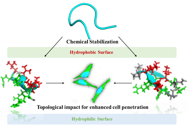 李子刚课题组近期在英国皇家化学会《化学科学》(Chemical Science)上在线发表了题为“Achieving Enhanced Cell Penetration of Short Conformationally Constrained Peptides through Amphiphilicity Tuning”的文章,该工作通过利用化学手段获得具有不同二级构象的稳定多肽,以不同两亲性短肽三维构象为切入点,尝试理解多肽拓扑结构对其穿膜能力的影响。