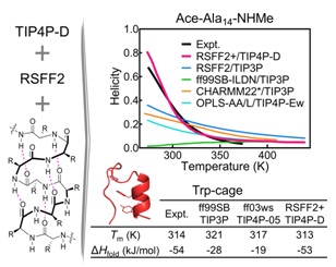 该工作在本课题组自主发展的残基特异性蛋白力场RSFF2的基础上,通过对α-螺旋氢键的进行能量修正,引入部分多体效应的影响,得到新的RSFF2+力场。该力场与新的TIP4P-D水模型搭配使用,能够显著改善蛋白质在不同温度下折叠态和非折叠态的热力学平衡问题,很好地重现实验测量的蛋白质折叠热力学数据。除此之外,这一方法还能够在不影响蛋白质天然态结构的情况下得到更加合理的非折叠态构象分布,同时实现了对具有特定三维结构的蛋白质和天然无序蛋白质的准确模拟。这一成果在一定程度上解决了以往的分子力场在描述蛋白质不同状态时存在的普遍问题,为蛋白质力场和水模型的发展提供了理论基础和新的思路。