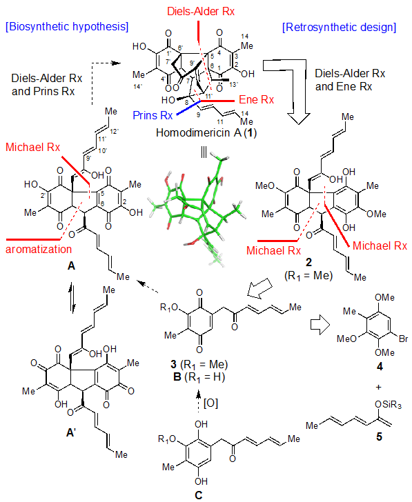 天然产物Homodimericin A 是2016年由Clardy小组由真菌T. harzianum WC13的代谢产物中分离得到的。该分子具有独特的六环笼状结构,含有八个连续的立体碳中心,特殊的骨架结构使得该分子对酸和碱都比较敏感,大大增加了对其全合成的难度。根据生源合成途径的推测,Homodimericin A 是由两分子对苯二酚单体(C)经过一系列氧化(C to B), Michael加成/芳构化反应(B to A)以及分子内Diels-Alder反应和Prins环化反应得到(A to 1)。