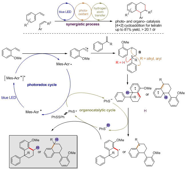 在黄湧教授与北卡罗来纳大学教堂山分校David A. Nicewicz教授(鹏程学者特聘教授)另一合作研究中,该策略被应用于可见光及有机小分子协同催化体系,高效构建多取代1,2,3,4-四氢萘衍生物,在德国应用化学上发表题为“Visible-Light-Mediated [4 + 2] Cycloaddition of Styrenes: Synthesis of Tetralin Derivatives”的论文(Angew. Chem. Int. Ed. DOI: 10.1002/anie.201702940)。