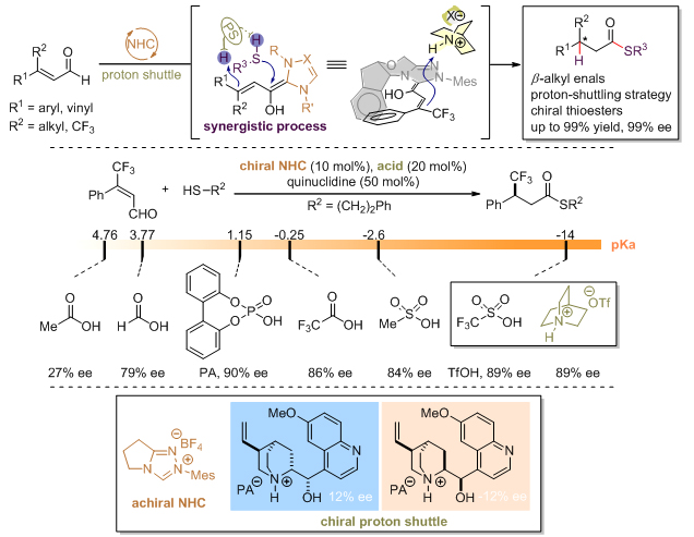 该质子转移过程基于协同催化体系(synergistic catalysis),使用氮杂卡宾催化剂(NHC)活化较具挑战性的β-alkyl-β-disubstituted enal形成β-极性反转的高烯醇中间体(homoenolate)。以原位形成的催化量奎宁环盐作为质子穿梭试剂(proton shuttle),在促进β-质子转移效率的同时加强活性质子对高烯醇中间体β位的手性识别能力。二者协同促进光学纯β-手性硫酯化合物的高效构建,而硫酯的后期官能团转化可获取多种β-手性羰基化合物并作为关键合成子。机理研究方面,加入酸性合适的Brønsted酸添加剂或者预先制备的奎宁环三氟甲磺酸盐均可实现高对映选择性,而非手性氮杂卡宾与手性奎宁的联用亦可得到一定的对映选择性,据此证明质子穿梭添加剂诱导的选择性氢转移是该协同催化策略的核心关键点。