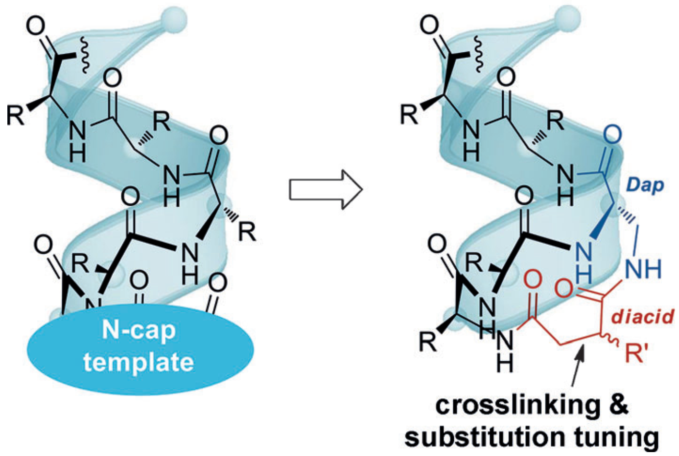 本研究中,研究人员设计了交联天冬氨酸作为螺旋成核诱导模块的方法。与之前的大部分末端诱导策略相比,该策略构建便捷,并保留了氮端氨基供进一步修饰,最终可以通过稳定提高螺旋短肽的成药潜力。该策略或可为螺旋短肽分子工具的发展提供可替代的解决方案。