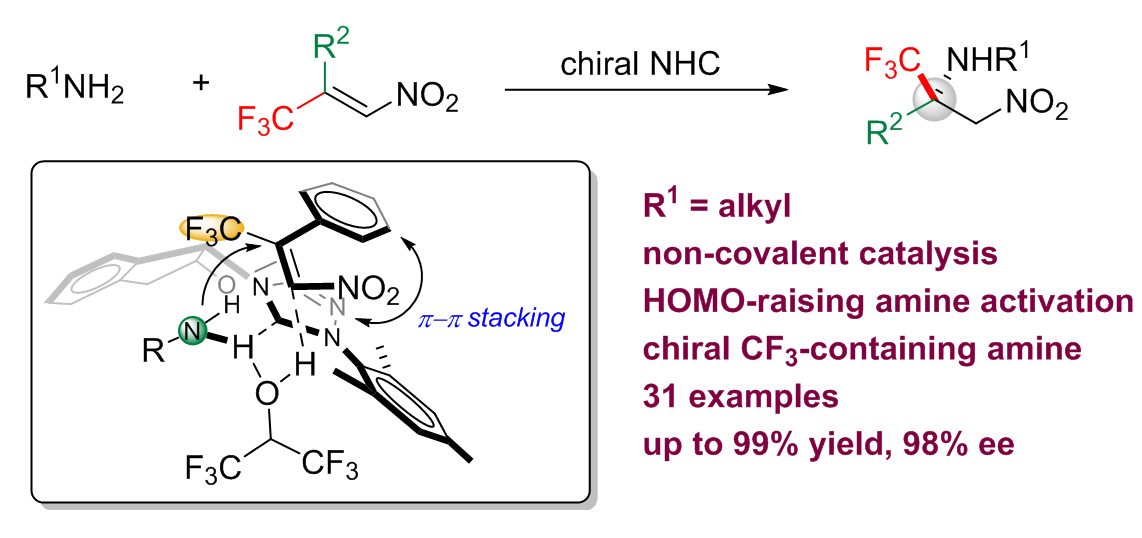 6, 4184)。最近,他们提出利用氮杂卡宾(NHC)的非共价作用,通过对碱性的胺进行最高占据轨道提升策略(HOMO-raising),首次实现了脂肪胺的不对称氮杂Michael加成反应。利用该方法,研究者以高产率和高选择性制备了一系列含有三氟甲基的二级胺类化合物,为含氟杂环药物骨架的合成,提供了新的化学手段。该工作由威廉体育williamhill深圳研究生院博士生王乐明与陈杰安合作完成,发表于《德国应用化学》(