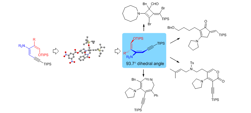 威廉体育williamhill深圳研究生院黄湧课题组最近发展了一个1,2,3,4-四取代丁二烯的合成方法。该反应条件温和,不需要任何催化剂或添加剂,具有高度的原子经济性。他们进一步发现这类分子不同于其他双烯,相邻的双键不是平面共轭结构,而是以近90度的二面角扭曲。因此,该双烯并不参与常规的环加成反应。研究人员进一步发现,这类炔二烯胺结构在不同的亲电试剂作用下,可以发生一系列新颖的环化、重排反应,生成多种环系(4到7元环)骨架,为双烯在非环加成中的合成应用,提供了新的思路和策略。研究结果发表于自然通讯杂志上(Nature Communications, 2015, 6, 6913)。该工作得到了中国国家自然科学基金(21372013)、深圳市孔雀计划项目(KQTD201103)的资助。
