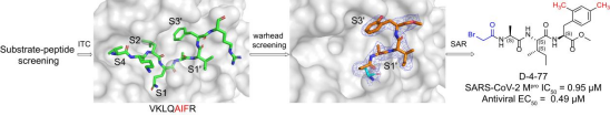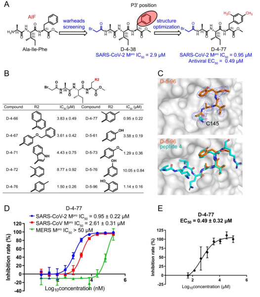 接下来,作者以多肽序列Ala-Ile-Phe (AIF)序列作为新抑制剂的骨架,在Ala的N-末端引入共价接头。通过测试不同的共价接头发现,含α-卤代乙酰胺型共价接头的化合物对SARS-CoV-2 Mpro具有抑制活性,其中以AIF为骨架,并含溴代乙酰胺共价接头的化合物D-4-38有较好的抑制活性。随后,作者以D-4-38为基础,探究了P3’位置的构效关系。作者解析了Phe(P3’)临位-羟基取代衍生物D-5-96/Mpro的晶体结构,确认了抑制剂与Mpro结合模式。通过优化,最终获得了抑制活性最好的Phe(P3’)临位和对位-甲基双取代化合物D-4-77(IC50 = 0.95 μM,抗病毒EC50 = 0.49 μM)(图3)。