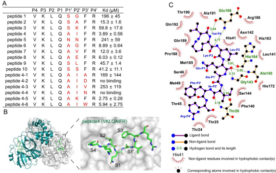 图2. SARS-CoV-2 Mpro S1’-S3’口袋的底物选择性及多肽/Mpro蛋白晶体结构