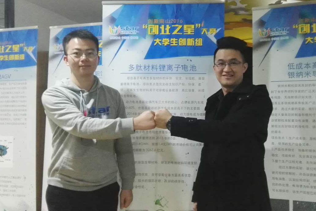 公司李子刚课题组团队,基于所发现的多肽自组装现象,与材料学,器件学结合,通过与耶鲁大学,清华大学,深圳大学等课题组密切合作,发现了多肽自组装材料在电学方面的优异性能。通过不断摸索,认为多肽材料在储能领域具有较大的发展前景。以胡宽,江意翔牵头的,孙程洁,李文君,林华灿,尹丰等参与,组建了“肽聚-多肽锂离子电池”项目团队。在李子刚老师的精心指导下,经过持续攻关,开发了多肽锂离子电池模型。该电池具有良好的安全性。同时,团队自主研发的新型生物材料环境友好,无毒,可降解,柔韧性优良, 在可穿戴设备方面具有优势,其作为正极材料组装的电池具有高比容量,较长的循环次数,良好的倍率性以及快充功能。