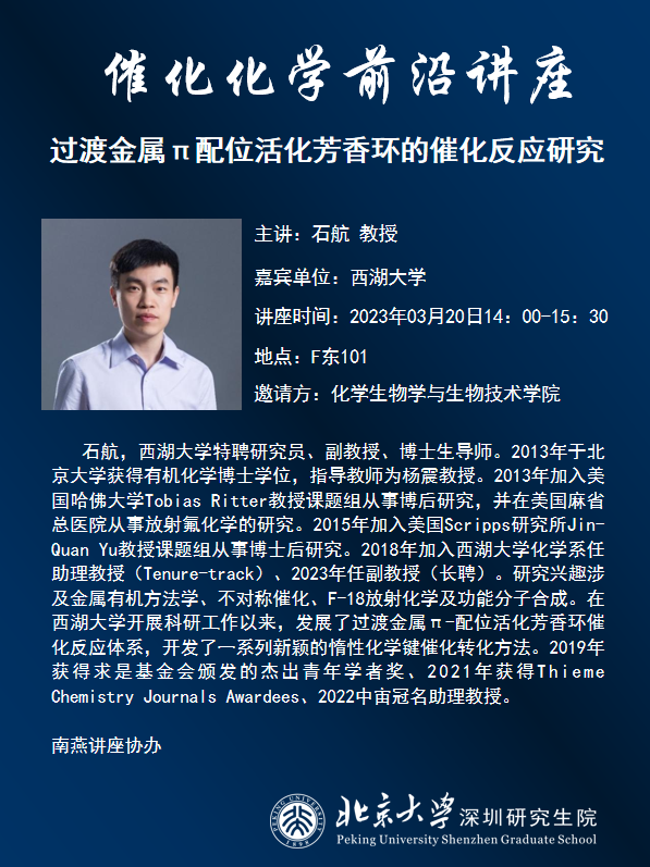 2023年03月20日(星期一),威廉体育williamhill邀请了西湖大学石航副教授到访公司并进行过渡金属π配位活化芳香环的催化反应的讲座,欢迎大家参加!