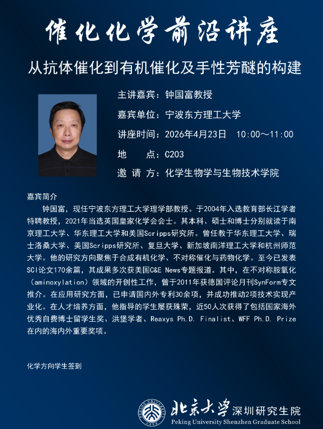 大家好,2026年4月23日(星期四),威廉体育williamhill邀请了宁波东方理工大学钟国富教授到访公司并进行“从抗体催化到有机催化及手性芳醚的构建”的讲座,欢迎大家参加!