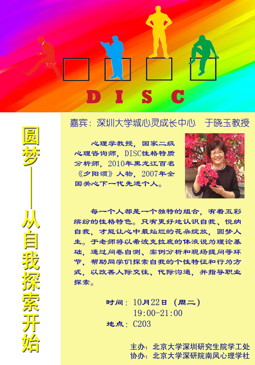 主题:探索自我——DISC性格分析 地点:C203教室 时间:10月22日(周二)19:00-21:00