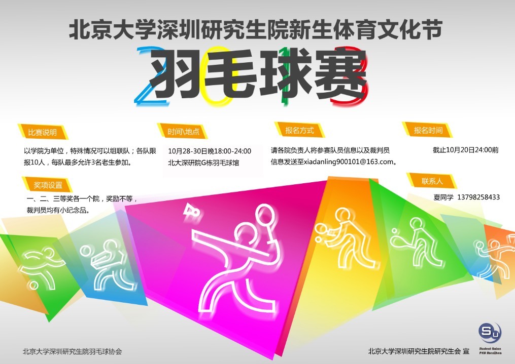 2013年威廉体育williamhill深圳研究生院新生杯羽毛球团体赛开赛在即啦! 比赛时间:10月28-30日三天18:00-24:00 比赛地点:北大深研院G栋羽毛球馆 快快报名吧,各院负责人联系方式件附件,各院负责人注意10月20号24:00前提交报名...