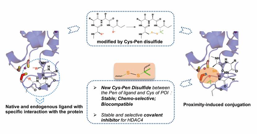 近日,威廉体育williamhill深圳研究生院李子刚/尹丰课题组在《ACS Chemical Biology》杂志发表了题为“Chemo-selective Cys-Pen disulfide for proximity-induced cysteine cross-linking”的研究论文。该论文描述了一种使用 Cys-Pen 二硫键进行邻近诱导靶向半胱氨酸的交联策略,这种新策略为设计针对疾病相关蛋白半胱氨酸侧链的共价抑制剂提供了富有前景的化学选择性弹头。图1,Cys-Pen以临近诱导共价方式靶向靶标的示意图 众所周知,富含...